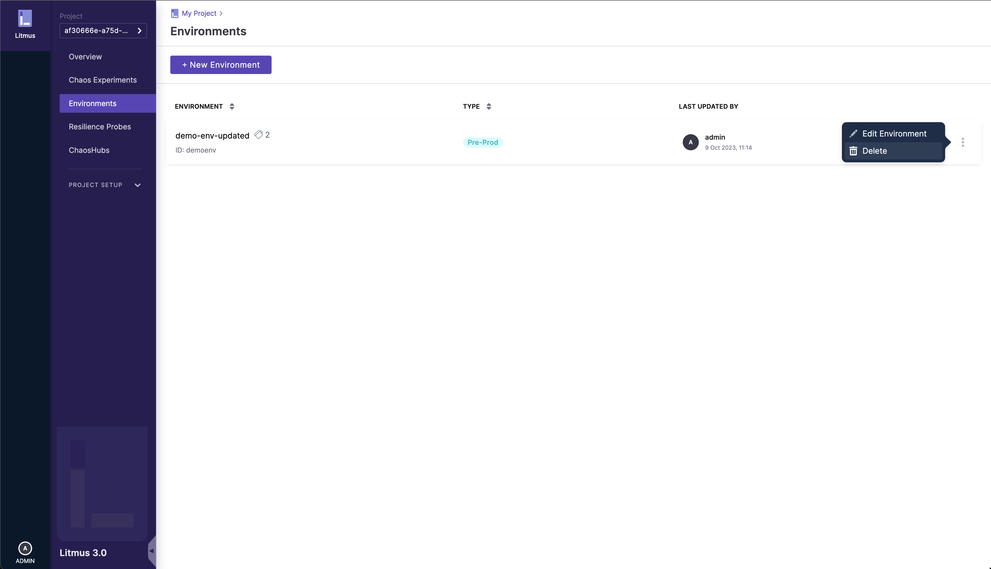 Navigate to the /environments page (Environments sidebar option on the left nav), click on the â‹® icon to open the options menu and select Delete option: