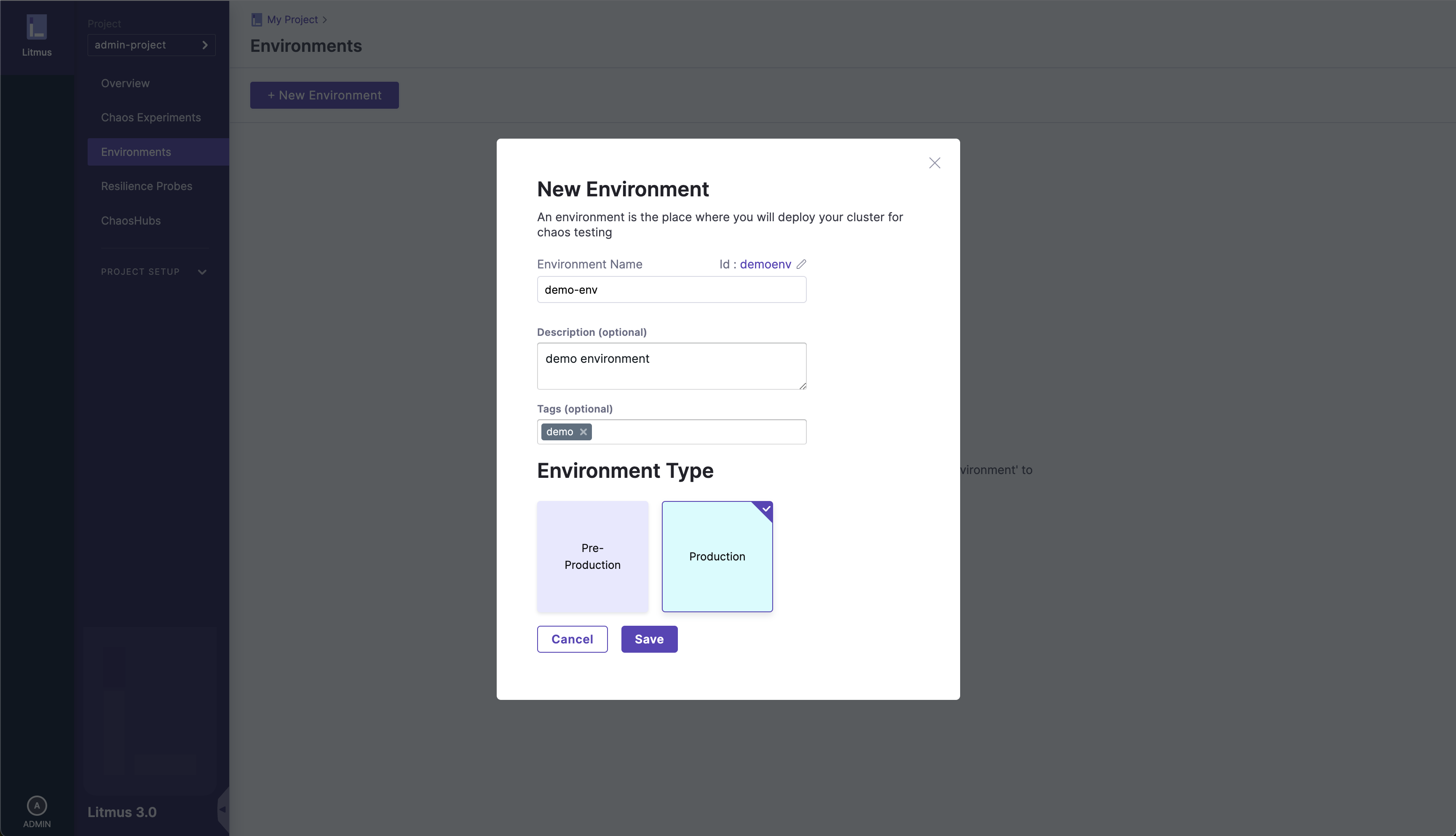 Add the details of the environment to be created such as name, description, tags, as well as the type of environment, i.e. Pre-Production and Production, these are meant to help further categorize the environments you are working with.